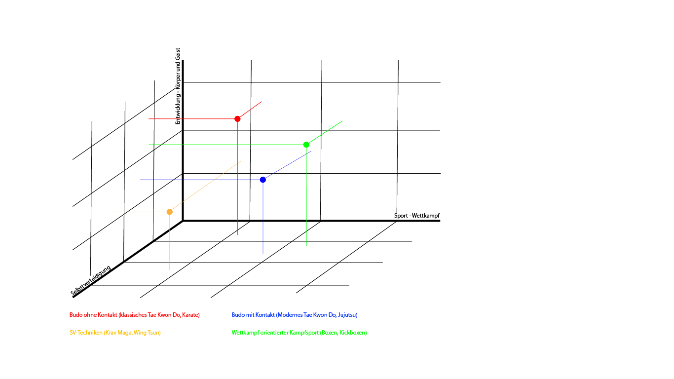 Zur Veranschaulichung habe ich in der folgenden 3d-Matrix versucht diese Zusammenhänge graphisch darzustellen. Die aufgetragenen Werte sind Schätzungen, zudem gibt es zum Teil auch innerhalb einzelner Kampfsportarten riesige unterschiede.